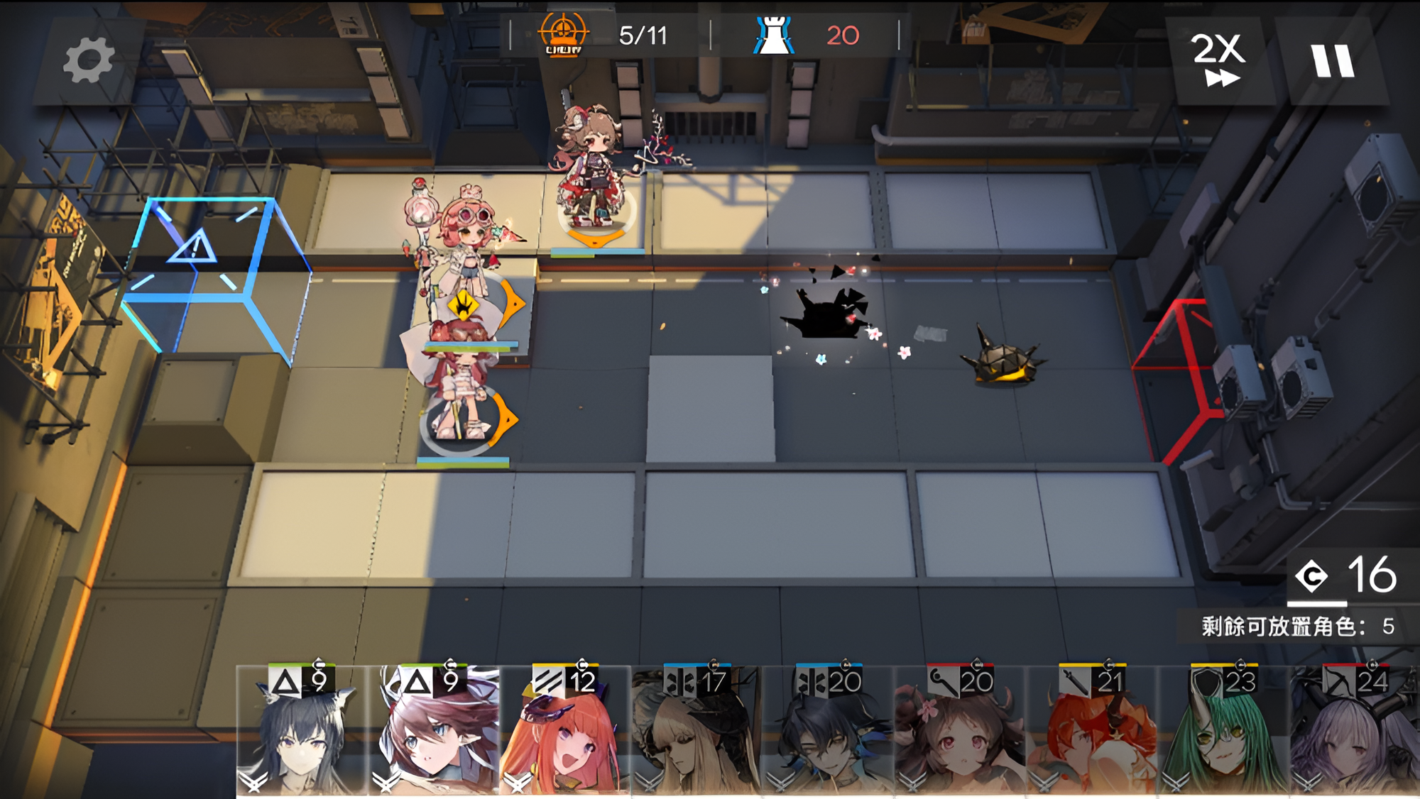Players need to deploy characters to block enemies from entering the blue door and defeat all enemies to complete the game.